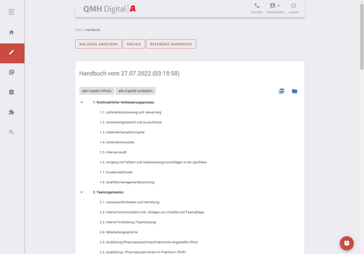 Der Vorstand der Landesapothekerkammer hat in seiner Sitzung am 18. Juni 2013 beschlossen, zur weiteren Unterstützung bei der Einführung eines Qualitätsmanagementsystems in der Apotheke ergänzend zu dem QM-Leitfaden allen Mitgliedern ein elektronisches QM-Muster-Handbuch anzubieten. Dieses richtet sich wie der Leitfaden sowohl an Apotheken, die ein QMS nach ApBetrO einführen wollen, als auch an solche, die eine Zertifizierung anstreben. Die Landesapothekerkammer bietet ihren Mitgliedern eine browserbasierte Lösung zur Realisierung ihres Qualitätsmanagements an. QMH Digital ist eine auf moderner Technologie basierende Software, mit der Apotheken einfach und zeitsparend ihr Qualitätsmanagementhandbuch erstellen können (https://www.qmhdigital.de/lp/info.php). QMH Digital wurde im Auftrag der Apothekerkammer Westfalen-Lippe entwickelt, die das System freundlicherweise auch anderen Kammern für die Nutzung durch ihre jeweiligen Apotheken zur Verfügung gestellt hat.
